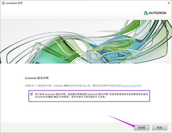9、如图所示,阅读Autodesk隐私声明,选择我已阅读……,点击我同意。