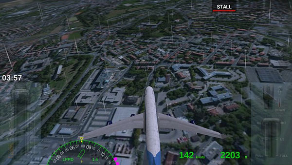 接下来是着陆模式,这是这个游戏的重点,我们需要先降低自己飞机飞行的高度,然后寻找到我们需要降落的跑到,接下来就是在空中调整自己飞机的姿态,使得自己的飞行角度和跑道的角度是一样的,然后慢慢的减速降落,落到跑道上时放下轮子进行慢慢减速直到停止。