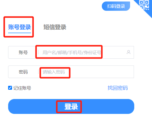 (2)使用平台账号绑定的邮箱、手机号、身份证号+密码登录;