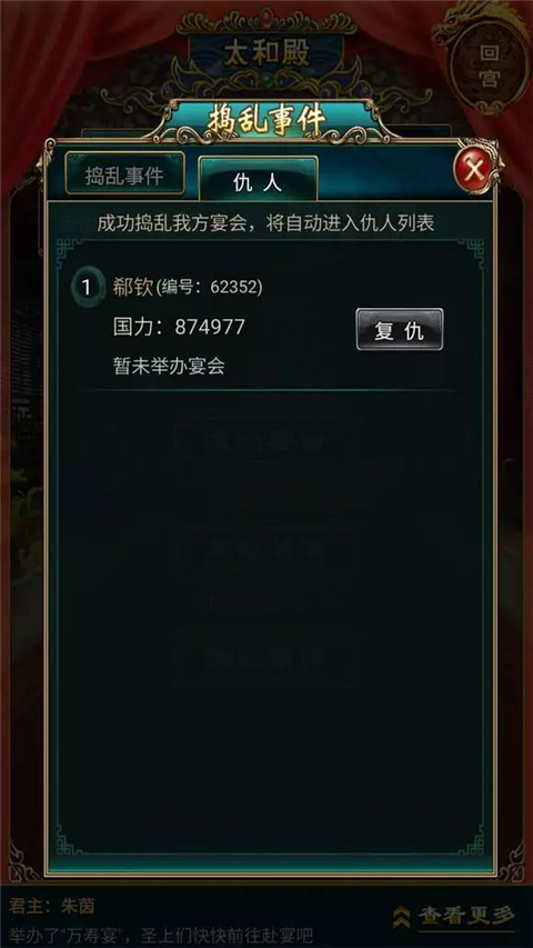 如果选择公开宴会信息,则将在太和殿主界面右下方【查看更多】点开后可查看到你的宴会信息,否则不能。公开宴会信息有利于更快完成宴会(坐满即完成),但有较大几率招来蟑螂赴宴。宴会开始一段时间后,进入【我的宴会】,可能触发皇子拜见获得更多活跃值。