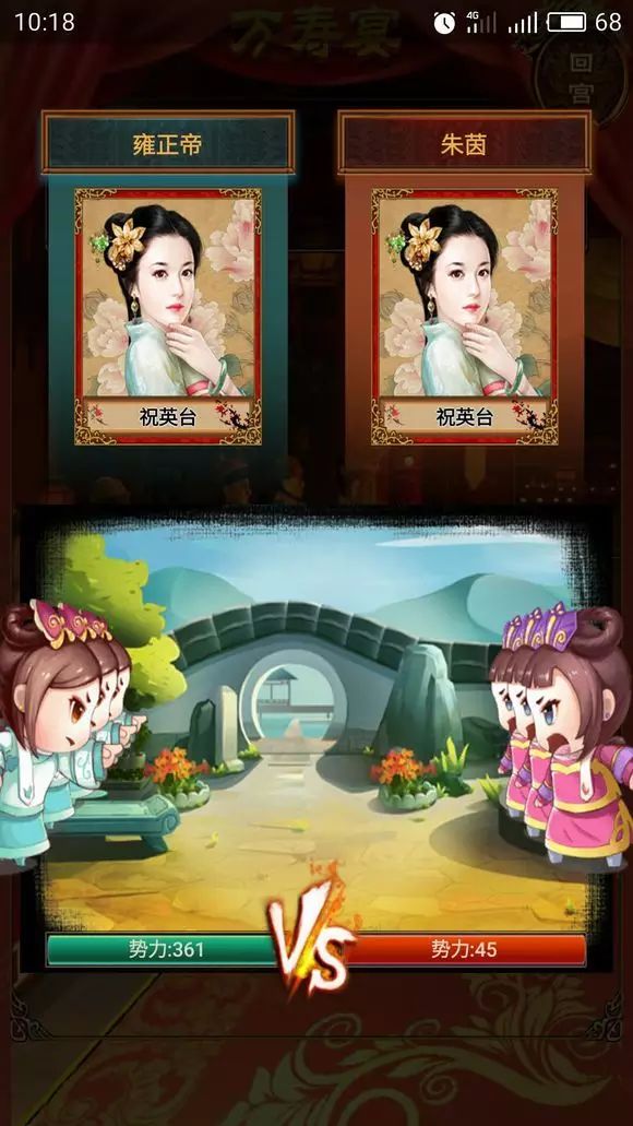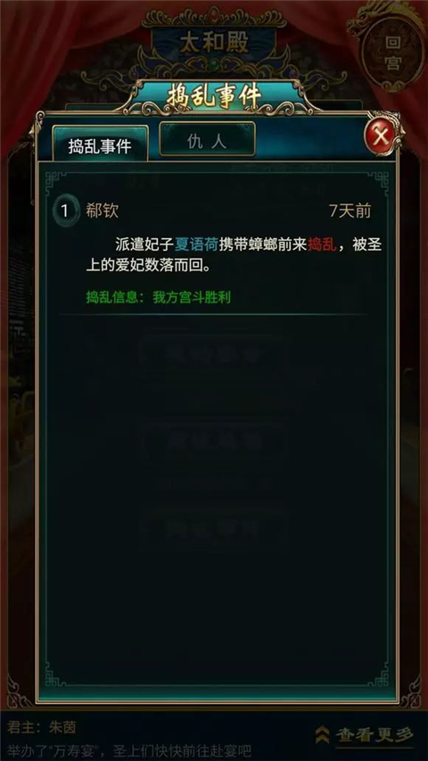 使用蟑螂赴宴,将触发摆宴的君主派出的主持妃子跟你的同名妃子宫斗,妃子势力就是血量,多则赢少则输,赢了会获得增加己方活跃值奖励,输了有可能导致妃子损失一名宫女。