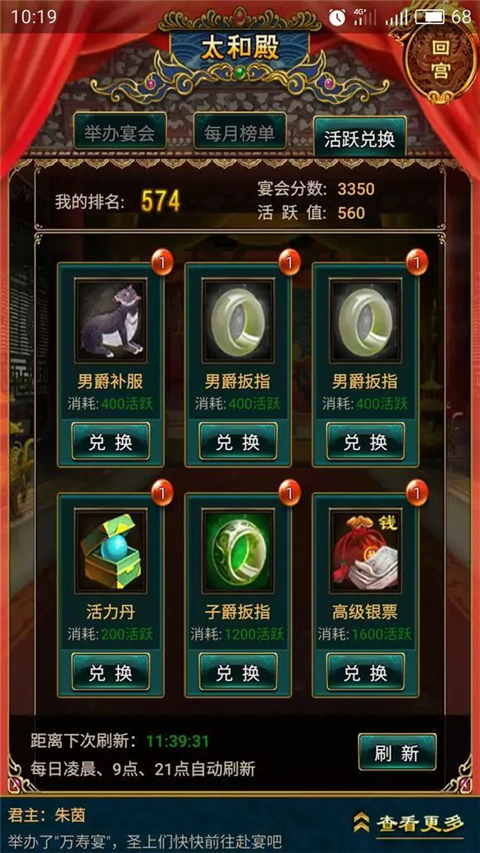 然后是活跃值兑换,每天都会自己刷新,手动刷新(不建议)请准备元宝。活跃值在蟑螂赴宴和举办宴会中获得。