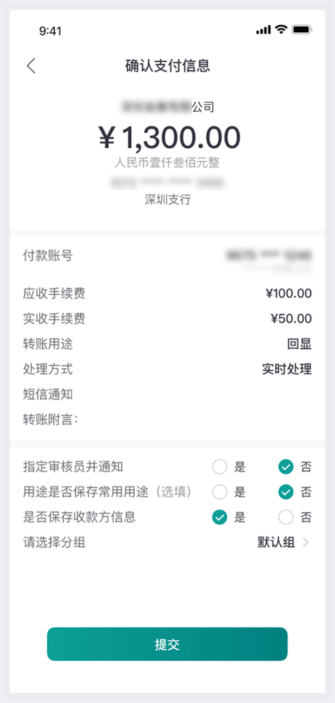 4、点击确定后,提交页选择是否将用途保存常用用途;是否保存收方信息,如若保存,则指定保存至对应分组;如指定审核员审核,点击选择指定审核员,并选择短信通知,点击提交。