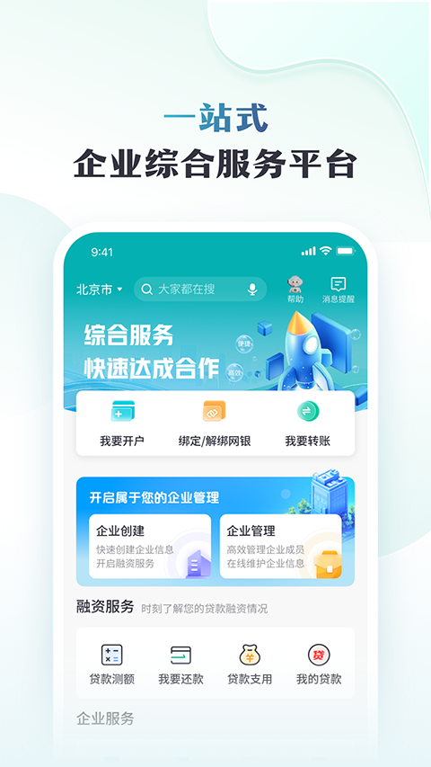 1、【丰富功能】 为客户提供账户服务、支付结算、投资理财、贷款融资、财务管理、小微指数、商机撮合等丰富功能及服务,让每部手机成为一个对公业务办理窗口。 2、【多版本】 打造“标准版”“小微版”双版本,为不同客群提供专属服务,标准版提供全部功能服务,小微版为小微客群提供专属贷款、小微指数等差异化服务。 3、【免U盾交易】 引入移动证书安全认证体系,根据应用功能与交易额度划定移动证书使用场景,客户无需携带U盾,即可在手机端办理动账类交易。 4、【渠道协同】 企业网银与企业手机银行在功能权限、交易流程、限额控制等维度统筹管理,实现客户在不同渠道间交易打通、权限复用,保证一致性体验。软件功能