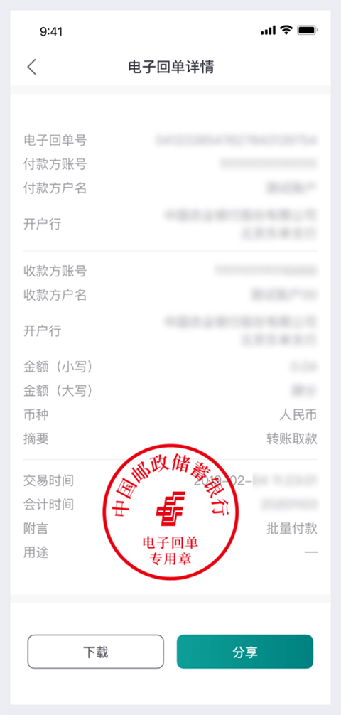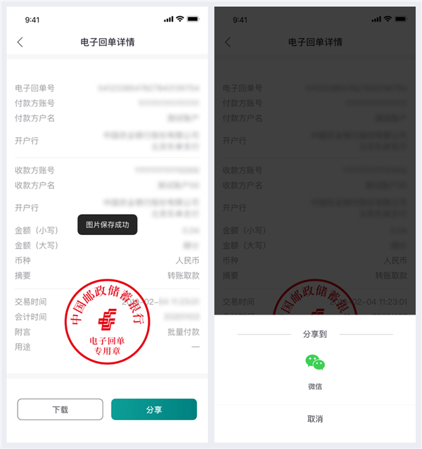 点击下载按钮,可将生成的电子回单以图片的形式保存至手机相册;点击分享按钮可将生成的电子回单通过微信等三方软件转发至收款人。