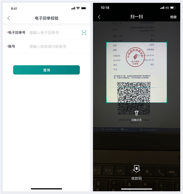 用户可通过电子回单校验对电子回单的真实性进行校验,用户输入电子回单编号和账号,或通过“扫一扫”功能,扫描或识别电子回单二维码反显电子回单号和账号进行校验。