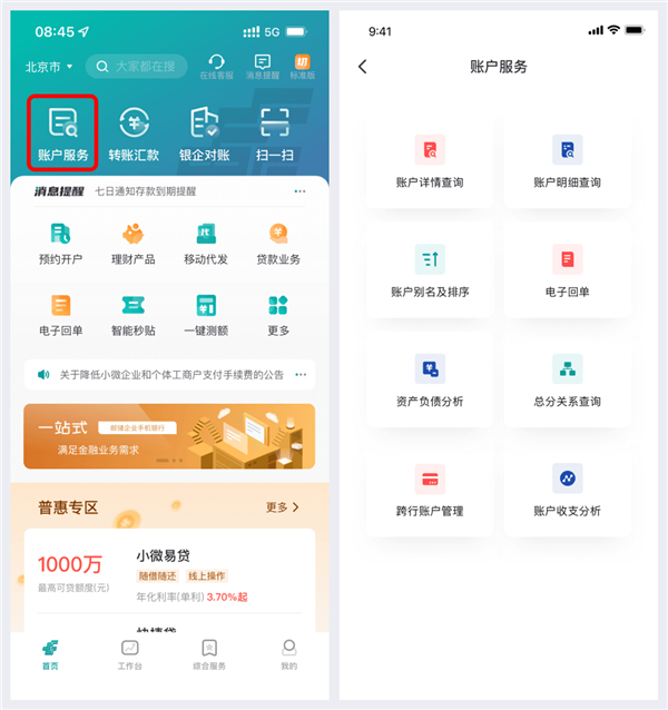 您可在首页页签下点击“账户服务”菜单,或通过工作台页签下选择全部功能中的“账户服务”菜单查询已签约网银的账户详情、余额、明细等信息。
