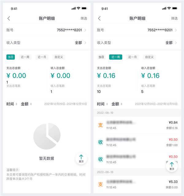 选择您需要查询的账户及时间范围(默认回显近一月,也可自定义),点击查询,查看相应明细信息,如下图所示: