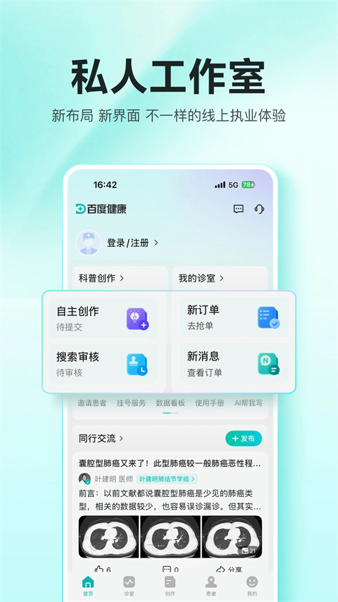 【专属权益】 百度健康亿级流量扶持,百家号、百度百科、直播等百度平台支撑,多种医生专属权益,全面助力医生打造个人品牌。 【AI分身】 医生可创建专属数字分身,助力高质量在线服务和内容创作。 【在线咨询】 接诊、咨询、医嘱、患者管理等一体化的线上诊室服务,提高医生接诊效率。互联网医院备案医生可在线处方。 【科普创作】 通过AI大模型赋能,帮助医疗从业者轻松创作优质内容,在百家号等平台实现影响力与价值的双重提升。 【患者管理】 医生可以对线上咨询和线下报到的患者进行分组管理,通过患教资料、问诊表等专业工具高效随访跟踪诊后患者病情,助力医生诊后管理。软件亮点