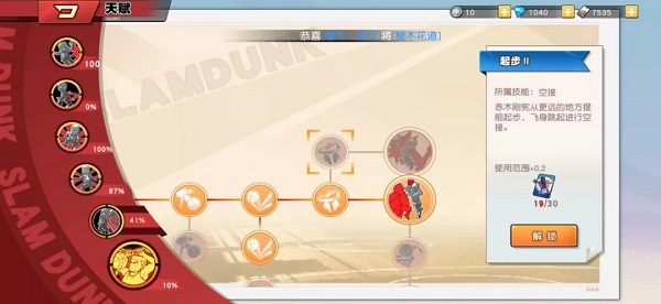 不同玩家的操作习惯不同,选择解锁天赋的顺序也会有很大不同。拿樱木花道来说,技能为:飞人(大招)、飞身篮板、庶民上篮、超级加速、哼哼防守和扑球。