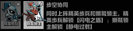 同时上阵精英步兵和狮鹫领主,精英步兵解锁【闪电之盾】,狮鹫领主解锁【静电过载】。