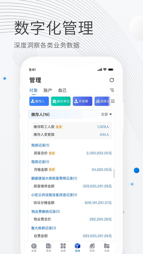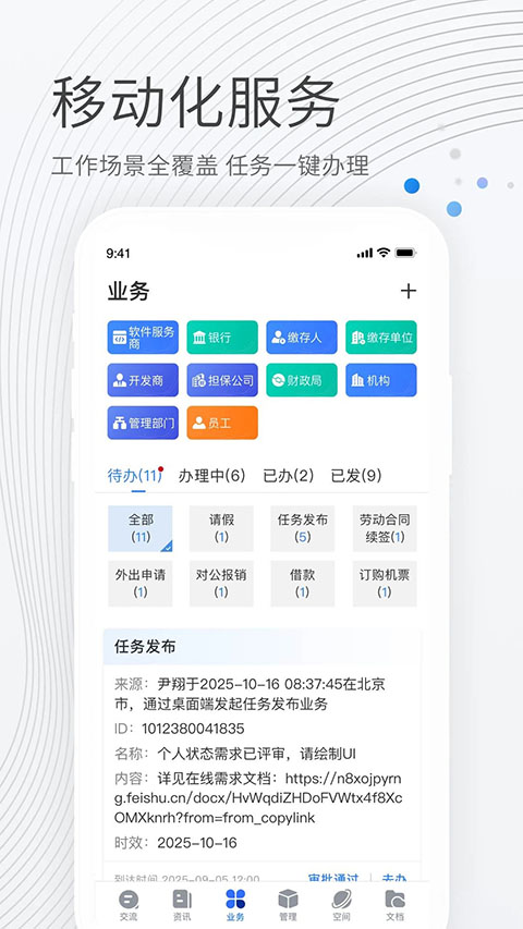 1、数字化管理 集成“人、财、物、事”的数据管理,变管理为管“数据”,由数据指挥组织。 2、移动化服务 打造移动化办公社区,实现服务“一次办结、一次不跑”。 3、全覆盖管理 涵盖党建、政务、公积金、企管、房产等场景及上千个事项。 4、全流程推送 变“人找事”为“事找人”,消息、通知、公文、审批等自动推送,工作办理灵活便捷,领导力和执行力量化管理。 5、结算、核算、统计、分析自动化 业务驱动财务,实现业务有发生,资金有变化,财务有反应,做到实时精准、由上到下、账实相符。使用教程