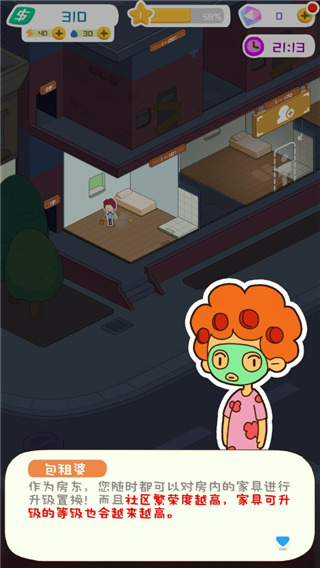 1、体验土豪房东的快乐 模拟土豪房东,掌管过亿地产,日进百万不是梦。躺着数钱的快乐,赶快来体验。 2、遇见形形色色的租客 在这个温馨的社区中,你不会感到孤单。 你是租客们的房东,也是他们的朋友。 在琐碎的生活中,你可以和租客交流分享他们的生活碎片。 3、解锁各式各样的房型 选择困难症?不存在的。不同风格的公寓别墅,丰富的房型随你解锁。随心所欲为你的租客提供舒适的居住环境。 4、探索丰富多彩的地图 你喜欢轻松舒适的海滨小镇还是夜生活丰富的时尚之都不夜城呢?这里的每张地图都有自己的特色和主题,你可以在不同的地图体验完全不同的生活方式。 5、打造专属于你的家 每个人都需要自己的私人空间,我们为房东开辟了专门的私人区域,独立的花园和宽敞的房间以及可以完全自定义的装修选择。你家的样子由你决定。游戏亮点