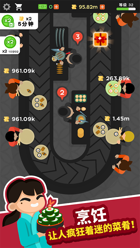 1、解锁并升级为知名主厨! 2、烹饪让人疯狂着迷的菜肴! 3、还有疯狂吃货大食怪相扑手助你一臂之力,收益轻松翻倍! 4、成为亿万富翁将不再是梦想! 5、你会成为史上终极的回转寿司大亨吗?更新日志