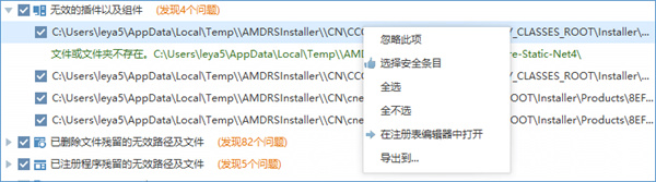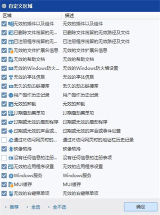 在窗口底部有3个额外的按钮,推荐,全选,全不选。这三个按钮仅当扫描完成后才有效。开始扫描前无法点击使用。具体功能与右键菜单中的选择安全条目,全选,全不选功能一致。