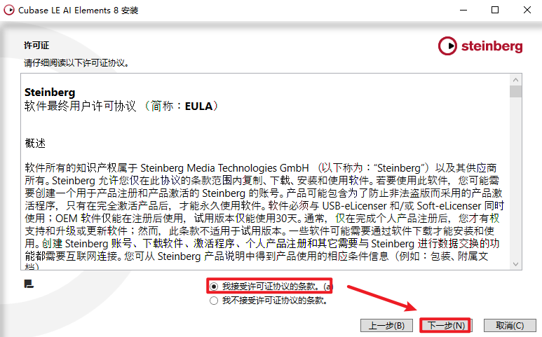 3、勾选【我接受...】,点击【下一步】。