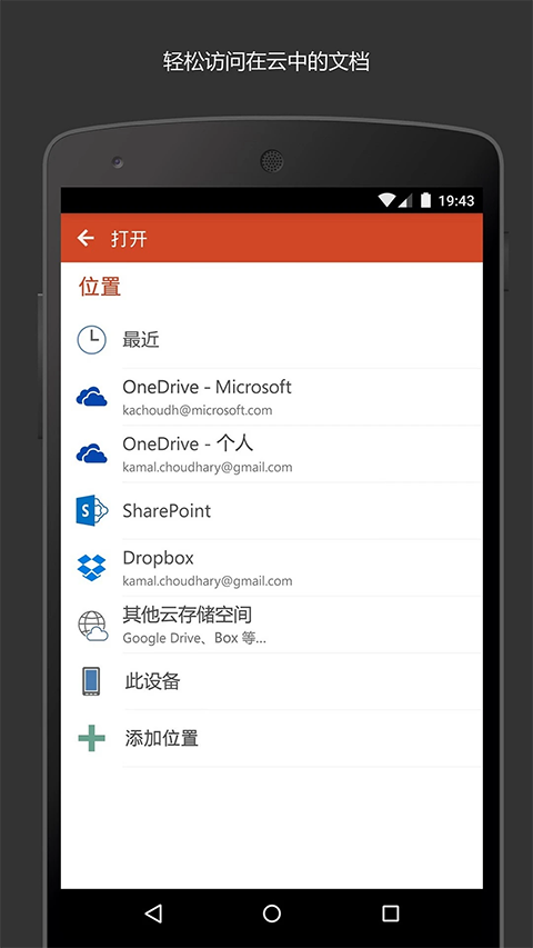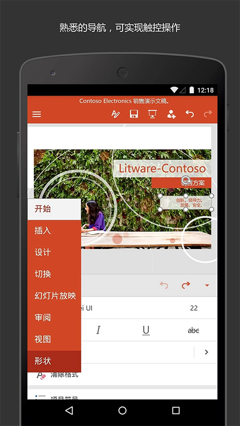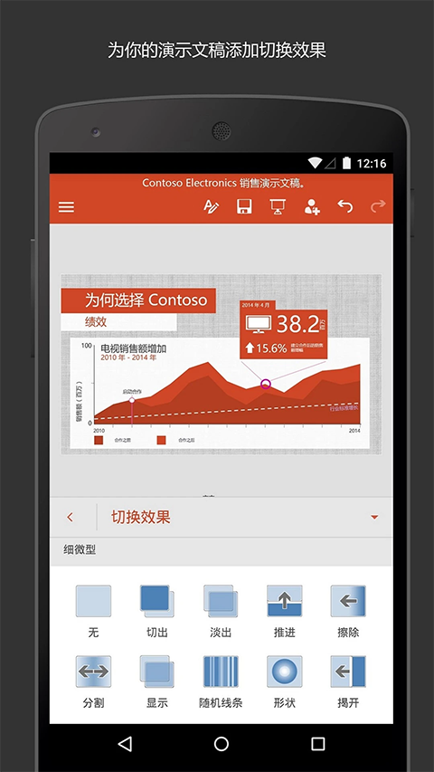 1、微软官方出品的PowerPoint (PPT) 拥有安卓端微软Office核心组件之一的PPT,您可以自信地展示您的演示文稿。这是一款专为安卓平台设计的应用,它带给用户完美的触控体验,并保证了熟悉的微软Office界面及品质。 • 微软安卓端Office带给您无与伦比的兼容性和布局的高保真度。您的演示文稿可以在安卓手机和平板上完美呈现。 • 功能区中熟悉的导航和菜单选项帮助您快速上手。 • 专为安卓手机和平板开发的PPT带给您熟悉的电脑端PPT的功能(图像、图表、动画效果、渐变等),并为您提供优化的触控体验及高效的移动办公体验。 • 安卓手机端微软Office应用为单手操作而设计,您可以轻松地使用屏幕下部的菜单按钮对文档进行编辑操作。不需要外接键盘或鼠标。 • 微软提供的精美模板可以激发您的创造力,使您轻松制作演示文稿。 2、助力您突破时间空间的限制,轻松搞定工作 无论您身处何地都可以高效办公 - 轻松访问云端的文件阅读并编辑。 • 通过丰富的格式样式、图表、动画效果、渐变、演讲者备注等功能,使用横向或纵向的排版方式完美表达您的想法。 • 创建功能强大的演示文稿变得很简单—自动缩放使得插入、移动、编辑图表和文本框都变得非常简单,只需要在屏幕上滑动您的手指,无需键盘和鼠标。 • PPT为您提供丰富的主题样式,使您可以随时更换演示文稿的主题。 • 您可以使用任何设备访问最近使用的文档,快速在上次没有完成的文档里继续操作。 • 有了免费的安卓端微软PPT应用,一个简单的点击操作就可以让您随时随地打开文档。您可以把文档存储在OneDrive、OneDrive for Business和SharePoint上,并随时使用多种设备轻松访问。 3、协同办公 随时随地在平板和手机上将创意分享给其他人。 • 与云服务无缝集成的PPT让您轻松分享演示文稿。 • 通过邮件分享一个链接或附件即可轻松将文稿分享给他人。 • 当您在邮件中分享演示文稿的时候,您可以对文稿添加独特的自定义消息。微软PPT手机版怎么删除幻灯片