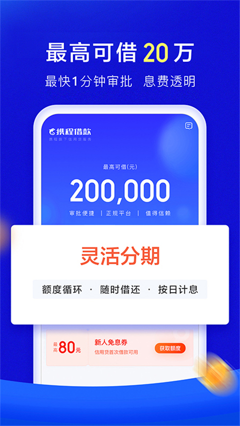1、灵活借款高额度 随借随还,可借高达20万。 2、偿还贷款息费透明 最高年化利率24%(单利)借钱更省钱。 3、申请流程更便捷 三步流程快速申请,手机操作极速到账。 4、正规平台值得信赖 官方正版平台,信息加密放款有保障。 5、资金来源权威专业 合规联手正规金融机构,稳定提供金融服务。 6、福利多多专享体验 即刻下载,享受新手大礼包应用亮点