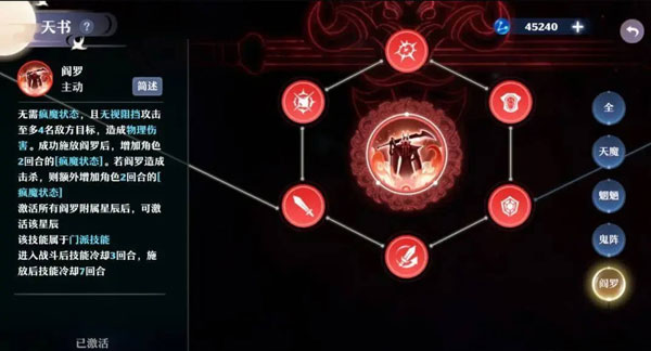 阎罗无需疯魔状态无视阻挡最多可以攻击4名敌方目标同时获得2回合疯魔状态,每击杀1个目标还可以额外为角色增加2回合疯魔状态;
