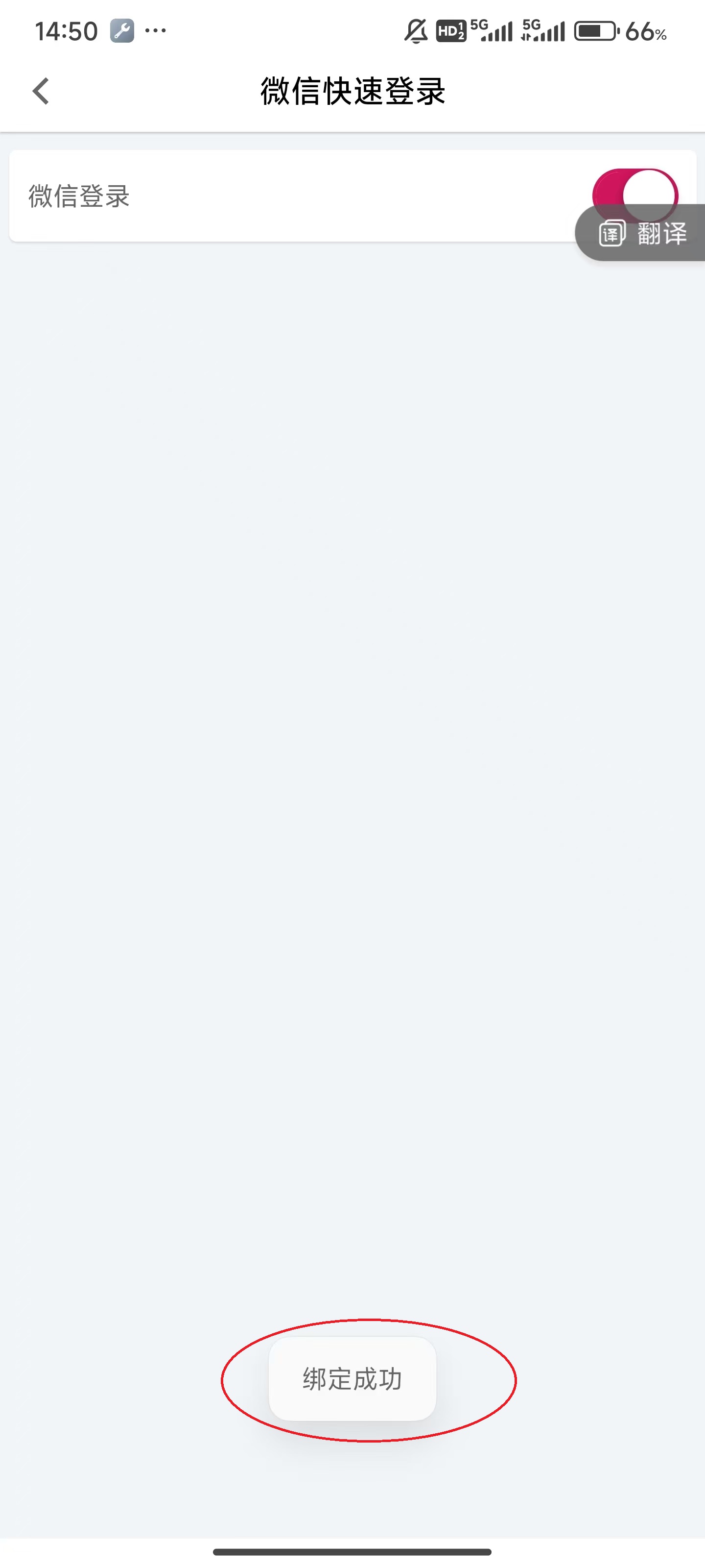 9、随后看到屏幕下方的“绑定成功”,就可以通过微信一键登录了,不用再通过手机号等待验证码或输入密码了。