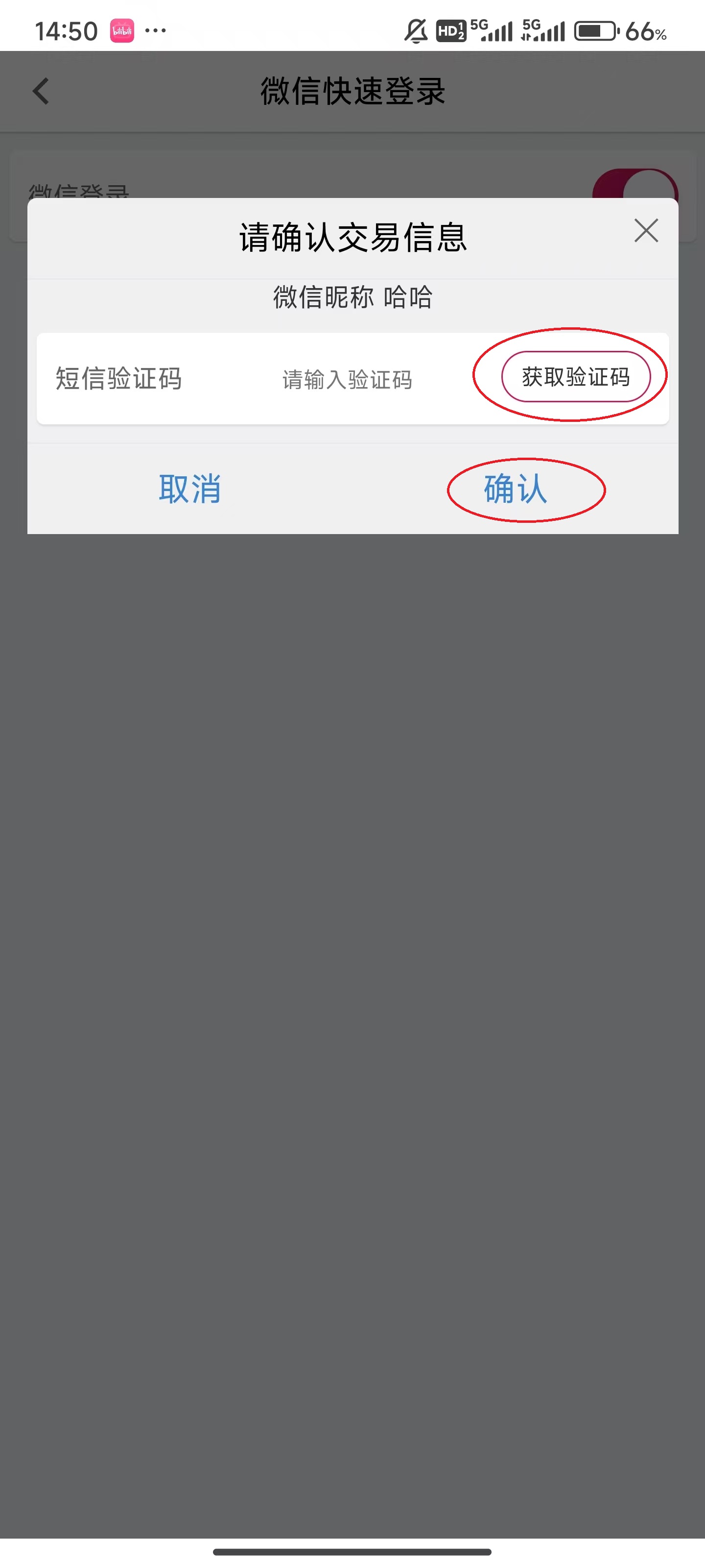 8、点击弹窗中的“获取验证码”,将验证码填写进输入框,随后点击弹窗右下角的“确定”。