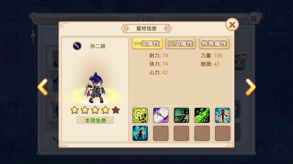 这里显示全部星将,包括不同等级、不同职业、解锁与否、免费与否(不免费不可上阵)。