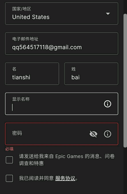 2、第二步国家地区默认会是【china】。国家和地区必须选择其他国家或地区,不然完成注册后,想要登录就会提示【对不起,您使用的凭证无效】!而一旦出现您使用的凭证无效,那么这个邮箱就废了,再也无法登录Epic!你只能换一个邮箱。推荐选择美国或者日本