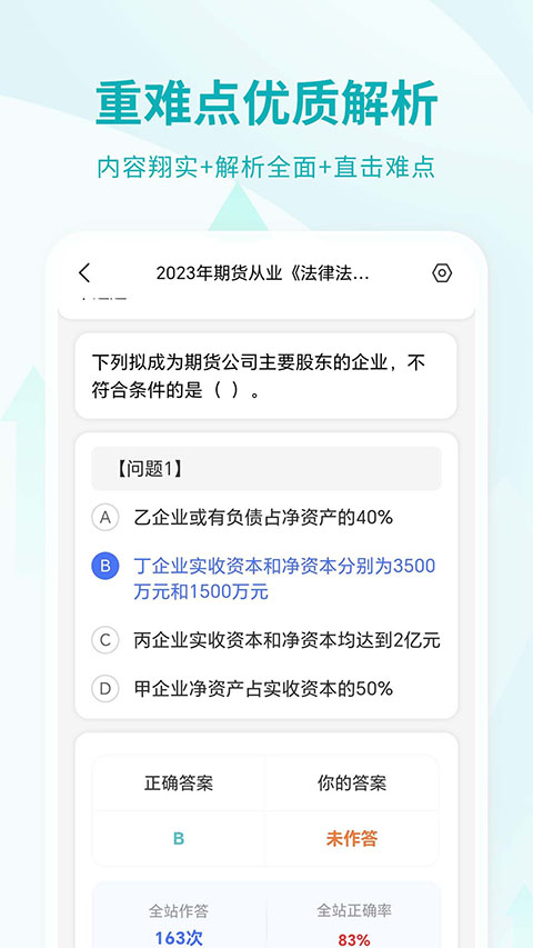 1、全面的考试信息汇总 提供了最新一年度的期货从业资格考试信息,包括报名时间、流程等详细介绍,帮助考生轻松了解考试相关事宜。 2、智能AI功能 对期货知识热点、难点、盲点进行智能归纳总结,为用户提供有针对性的学习内容,提高学习效果。 3、丰富的学习资源 提供包括历年真题、模拟试题、章节练习、知识点练习等在内的丰富题库,用户可以根据个人需求选择不同类型的题目进行巩固和提高。 4、实时互动答疑 超过百位专业讲师进行线上直播授课,实时互动答疑,让用户在学习过程中能够获得及时有效的解答。应用功能