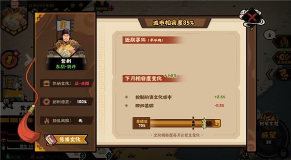 【碎镜·父与子一】:要求我们与波斯文化相容度提升至60%,游戏中可以对自己占领的其他文化的城池赠送名篇传播文化,从而提高对应的文化相容度。