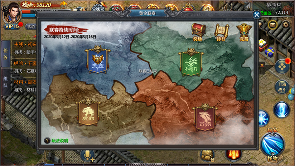 黄金联赛是本次周年庆推出的全新PVP玩法,天罡、神机、贪狼、虎豹,各个帮派组成的四大阵营激烈对抗,加入攻城车、夺旗战等多种元素,玩法丰富,战斗激烈!和兄弟们一起并肩作战吧!