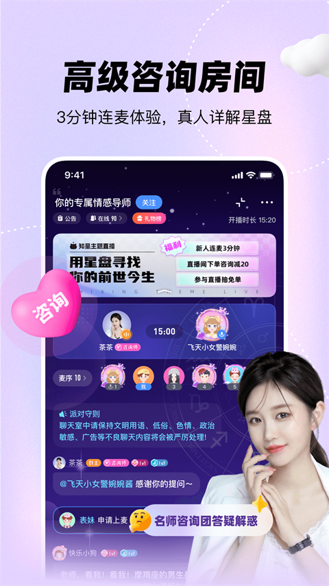 【情感问题 心理倾诉 随时陪伴】 专业认证咨询师24小时耐心倾听,只为解决你的烦恼; 情感、事业、财富、求学,众多项目任你选择; 语音房在线连麦,效率更高,更及时; 【开放社区 心情树洞 惊喜派对】 多元社区,与志同道合的人分享星座与生活; 星座干货分享,在社区与专业达人共同进步; 多人派对房间遇见懂你的人; 【星座解读 缘分鉴定 爱情报告】 星盘分析,全面解读,了解真实自我; 缘分合盘揭秘亲密关系,鉴定缘分深浅; 生成专属爱情报告,揭秘脱单时间,你的恋情解读专家更新日志