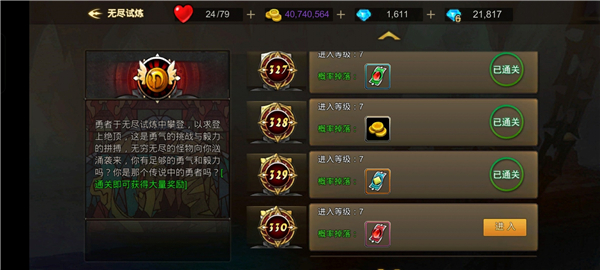 在【无尽试炼】探索各层可获得无尽试炼金币、神圣召唤劵、神秘召唤劵。