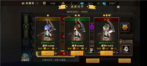 【封魔塔】25级开放,封魔塔共30层,每5层为一个大关,共6个大关。其中包含为战斗层,宝箱层,祝福层; 每层战斗都有菜岛,大虾,大神三个难度对手供选择,将对方击杀则为胜利,胜利即可获得对应难度的封魔星和封魔币。