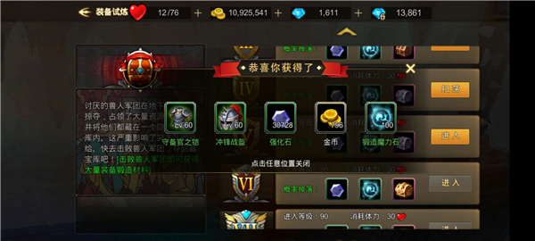 在【装备试炼】 处击杀兽人军团即可获得大量装备锻造材料。进入等级分为30级、40级、50级、60级、70级、80级直到最高110级,此副本也一样,只要有体力,次数无上限。