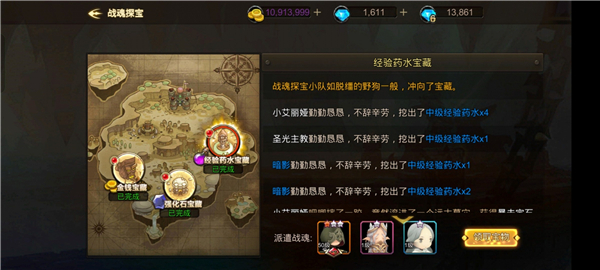 在【战魂探宝】中派遣三位战魂到【金钱宝藏】、【强化石宝藏】、【经验药水宝藏】三块区域进行探宝,每个宝藏图里都有机会获得对应的奖励,更有可能掉落符文、锻造材料以及战魂碎片哦!