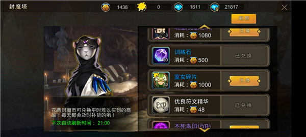 玩家在【封魔塔】的战斗层所获得的封魔币可在封魔商城购买稀有物品,封魔商城可兑换魂晶、符文精华等物品。