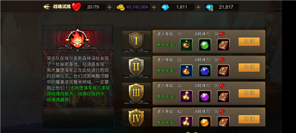 1、技能书、经验药水或者魂晶 快带着你的战魂进入【战魂试炼】,有几率获得战魂技能书、战魂经验药水、战魂魂晶等。进入等级分为10级、22级、32级、42级、52级、62级直到最高102级。每个关卡每日有2次进入机会,每次消耗30体力,第一次打需要手动,之后可以扫荡即可,方便快捷,此试炼只要有体力应该无次数上限。