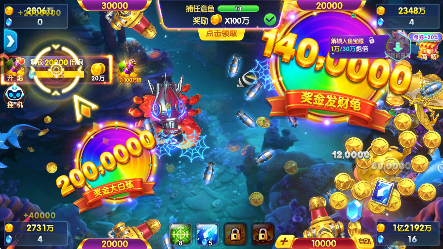 1、在游戏中,出来捕捉普通的鱼类,还会出现各种超级boss,将其捕捉可以获得大量金币,使用屏幕下方的“锁定”和“冰冻”道具可以极大增加捕捉概率。