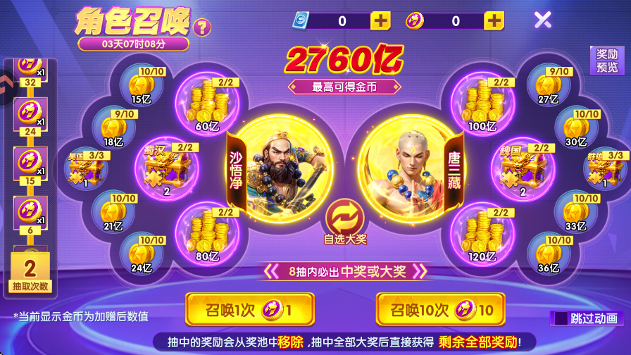 5、游戏还有角色召唤奖池,可以抽取专属的角色,还有海量金币可供玩家抽取。