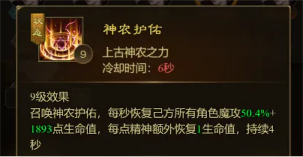 4、神农护佑:每秒恢复己方所有角色基于魔攻的生命值,持续4秒。
