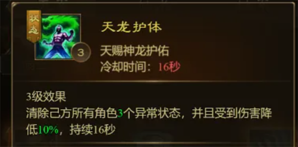 6、天龙护体:清除己方所有角色部分异常状态,并且持续时间降低受到的伤害。