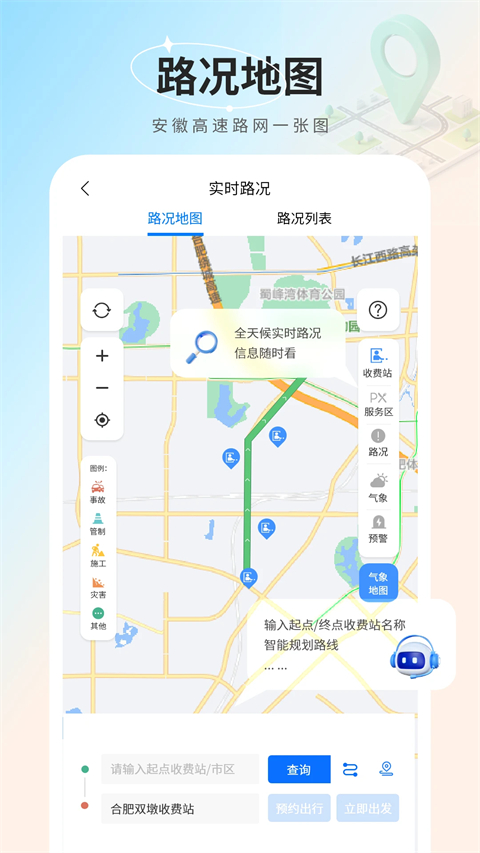 1. 全省服务区查询,全省服务区开启、关闭状态、服务区位置及导航,服务区限行,油电汽修、吃住娱购等服务便捷查询。 2. 全省收费站查询,可切换查看正常/限行/关闭收费站。展示收费站出入口属性、所属县区、车道信息、限行要求。 3. 实时路况查询,实现路况查询、出行路径规划、预约出行、路况订阅、导航与语音播报,快速查看高速线路沿途充电桩、加油站、服务区、收费站、路况、省/市/县天气预报与天气预警信息。 4. 高速气象查询,支持以列表、地图图标方式,按地市查看当日气象、预警信息,根据实时位置信息,为用户提供附近气象、预警信息。 5. 高速救援,与阳光救援小程序协同,支持高速公路异常事件安全防护指导、紧急电话查询和快速拨打服务,救援过程中,实时更新救援进度。 6. 充电站查询,集成各高速充电站小程序,直观显示各充电站可用枪数量,费用信息直观透明化。 7. 加油站查询,集成高速石油、高速石化的油品数据,实时、公开的油价信息让用户更信任。 8. 路况订阅,高频通行路段及重点关注路段的信息订阅,及时消息推送。 9. 直播,目前支持安徽ETC直播间、皖美高速直播间、安徽交通运输的直播观看。 10. 外接部级e路畅通小程序。 11. 安徽ETC配套服务,包括ETC办理、ETC激活、ETC充值、ETC查询、高速公路资讯、客服等功能。功能介绍
