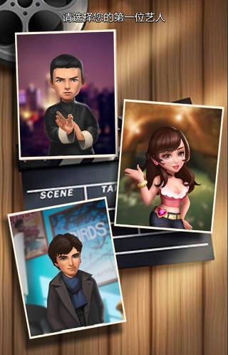 2、然后我们正式进入游戏,我们的主角来到的爷爷的电影院,一段啪啦啪啦的剧情后,游戏会给我们三个四星艺人抉择一个,还是挺良心的,分别是中国,美国,日韩三个国家的艺人。这里小编选择中国艺人,因为后面推市场是时候会比较简单。当然也可以选其他的艺人,只要在后续的招募到其他国家艺人影响不大。选择完艺人后,就可以整体体验游戏了。那么接下来就开始拍摄吧。