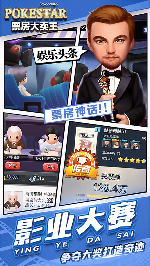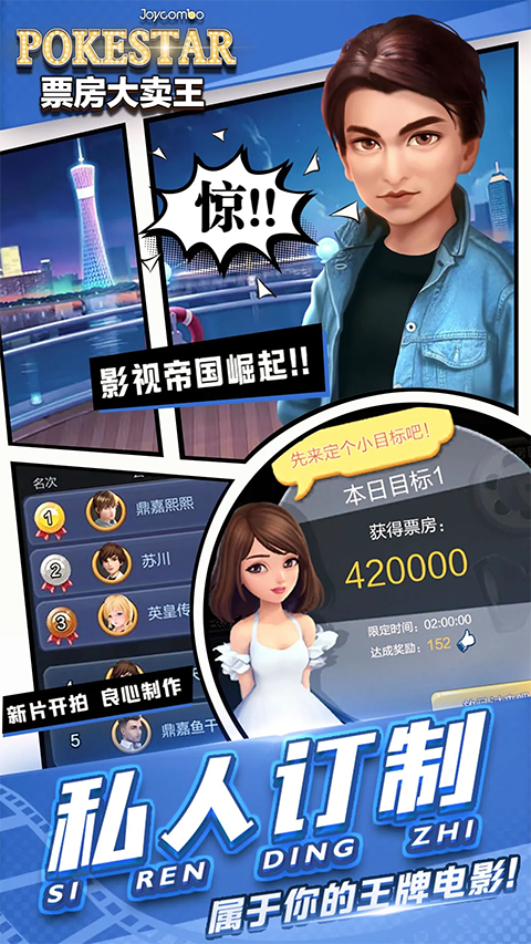 1、比赛排行:影片上映完之后,会出现我们的影片票房排行,在这里可以看到其他玩家的排行情况,有木有想努力冲上榜首的冲动。 2、持续收益:拍摄完影片后还会有持续收益,这里可以产出大量的美金。 3、招募艺人:由于我们上一步电影出演角色不够,影片属性大打折扣,我们可以通过建筑艺人教室解锁艺人招募功能。每次探索会随机出现2-3个艺人,因为我们已经有了一个女性角色,这里我们就选择招募3星男性的任地仔。1星的艺人不太建议招募,目前游戏还没有更新低星升高星的艺人。 4、市场占领:经过一系列主线后我们会解锁市场功能,市场可以产出大量的金币和粉丝,派遣合适的艺人担任形象大使更会提高资源产量。越往后的城市产出资源越高,还有别忘了资源会有资源存储上限,记得偶尔上线领取一下。 5、奥斯卡颁奖:奥斯卡颁奖会在每天晚上的10点惊喜,会对今天所在档位的比赛玩家惊喜颁奖,最后还会对今天拍摄情况进行评定发放奖励。所以我们需要多拍电影才能获得更多的奖励。票房大卖王小米版必得角色大全