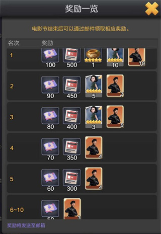 每周末的电影节持续两天,总共4轮竞赛,每轮比赛都会根据当前比赛档位和分组内排名给与对应的热映好评券。好评券可以用来兑换剧本,资产,艺人碎片等奖励。