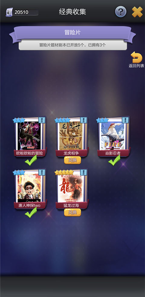 此处小编点开冒险片为例,可以看到,小编总共成功完成了五个冒险类型剧本的挑战。其中《欧拉欧拉的冒险》、《焱影忍者》、《唐人神探two》显示打勾,说明小编的剧本库中已经包含了这三个剧本。而《龙虎相争》与《猛龙过海》提示兑换。