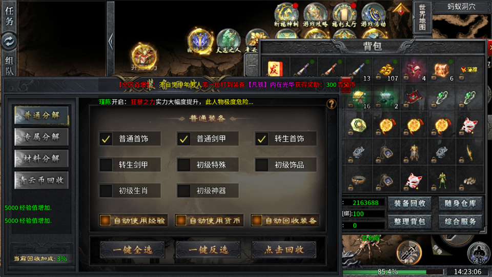 2、刷怪可以掉装备会自动获取,背包满后需要清理背包装备,可开启自动回收功能;