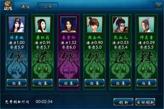 今天为大家的带来的蜀山传奇移动版攻略,希望对各位剑仙有所帮助。 首先来介绍一下游戏中的三种职业:儒的作用很明确,输出和控制(混乱+沉默);道主要做T兼职输出(控制效果只有1个,就是眩晕);释属于万金油,即可以输出,也可以做T,但在初期技能装备没成型的时候主要地位是辅助,如果装备和法宝成型的话,以后期的技能和法宝来算,输出和抑制作用非常强;目前比较流行阵容搭配有2道1儒2释、1道2儒2释(推荐这两种)。了解了基本职业,我们现在进入游戏。 1、酒馆招将任务 10级时接到任务在酒馆处招募散仙,10级时可以带一名散仙,然后每10级可以多招募一名。 在招募界面左下方有一个免费刷新时间,每1小时有1次免费刷新将领的机会。当免费时间,别犹豫就用它了。酒馆里每次刷新出6名随机将领。当免费时间没有到时,也可以使用仙石或者礼券刷新酒馆。一般手动刷新几次就可以出蓝色品质以上的散仙,自动刷新可以选择将领的品质,以及最大刷新次数。 仔细看散仙的“潜力”和“资质”,这是决定散仙强弱的重要标志。无论怎样,刷出蓝色的散仙就先招募过来(如果是1、10潜力以上的就更好了)。然后再手动刷新出蓝色散仙给20级预备着。如果第一个蓝色散仙潜力太低,新刷出1、1以上的,可以解雇掉第一个,将第二个招募过来后再手动刷新。