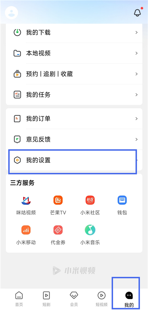 1、打开小米视频app,进入【我的】页面,下滑点击【我的设置】。
