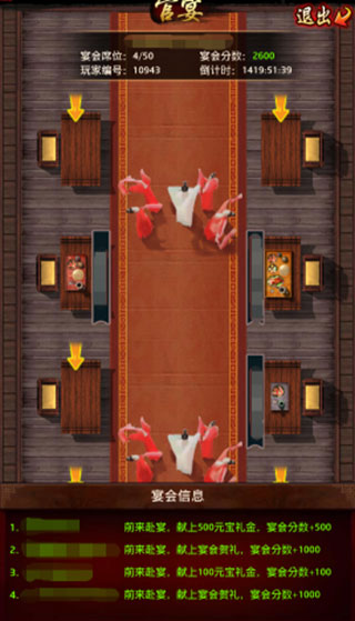 2、参加宴会需要交付元宝礼金,交多少元宝,可以获得和元宝相等的积分(积分用来兑换资源)每日限赴宴三次。